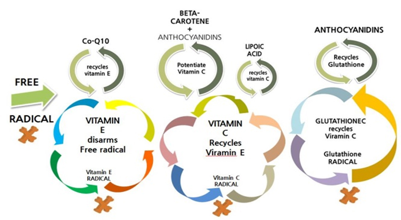 따라서 1~2가지의 항산화제 만으로는 여러 종류의 활성산소를 제거하기에 충분하지 않습니다. 또한 항산화제마다 활동하는 영역이 다릅니다. 즉 지방에 녹는 지용성 항산화제는 세포막과 세포질에서, 코엔자임Q10은 세포 내의 미토콘드리아에서, 물에 녹는 수용성은 혈액과 세포 간질에서 주로 활동합니다. 따라서 다양한 종류의 항산화제를 최소한 4~5개 정도 복용하는 것이 효과적입니다.